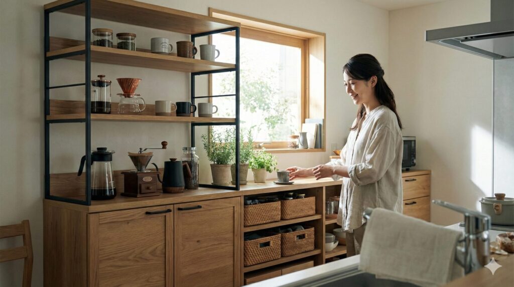| 見せる側 | 毎日使うカップ、皿、コーヒー道具 | 定位置を決めて数を増やしすぎない |