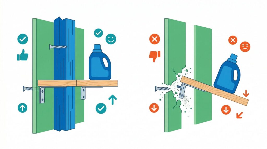 棚を設置すると、手前に引っ張る強い力がかかります。ボードだけの壁では、数日後に剥がれ落ちる危険さえ否定できません。洗剤の重さは想定を超える荷重となり、壁を傷めます。下地確保こそが絶対条件です。